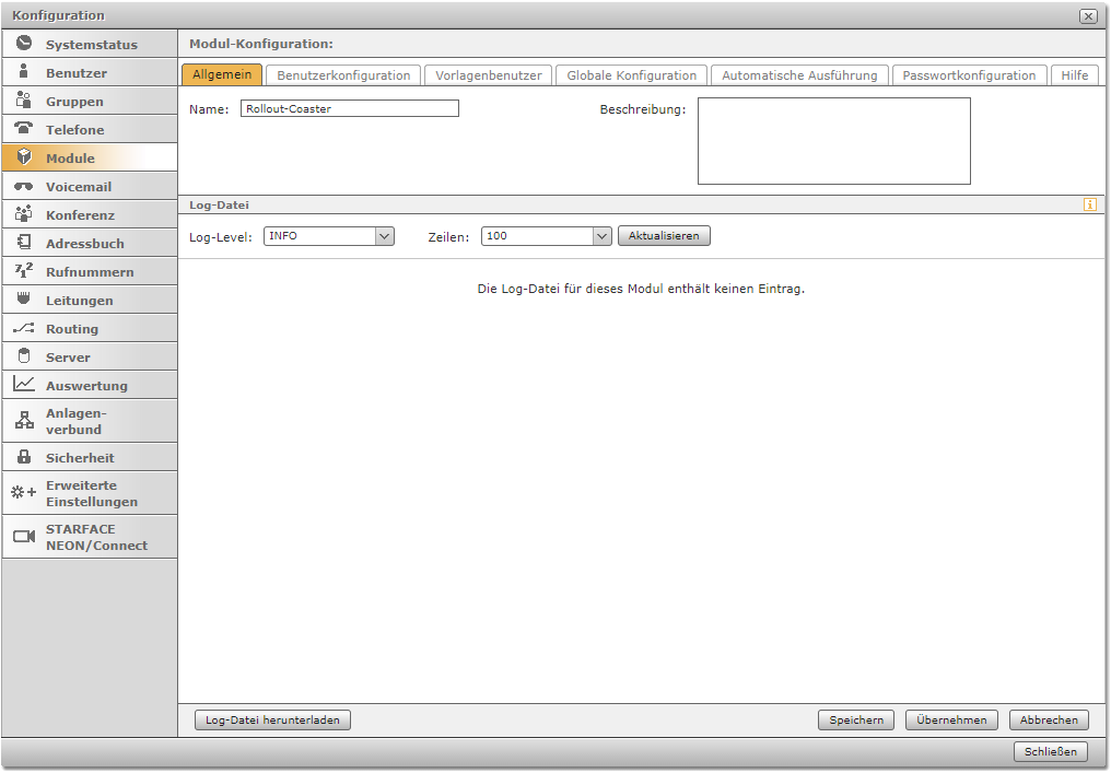 Jedes Modul informiert in den Levels "ERROR, WARN, INFO, DEBUG, TRACE" in den jeweils verschiedenen Abstufungen über Prozesse, die im Modulbetrieb ablaufen. Falls ein Fehler auftritt hat man hier die Möglichkeit, die Logdatei zu speichern. Standardeinstellung ist das Level "INFO".