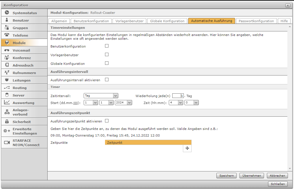 Aktiviere mit der Checkbox "Ausführungsintervall aktivieren" die Zeitgesteuerte ausführung des Rollouts.