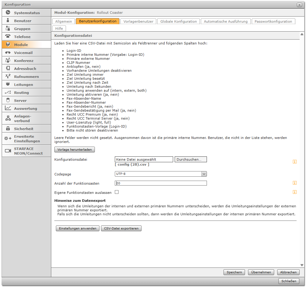 Hier besteht die Möglichkeit eine .csv Konfigurationsdatei hochzuladen. Die Datei muss Semikolon (;) als Feldtrenner benutzen. In der Benutzerkonfiguration kann lediglich eine .csv Datei hochgeladen und die Codepage der Datei angegeben werden. Unter "Anzahl der BLF-Tasten" kann zudem ausgewählt werden, wie viele BLF-Tasten kopiert werden sollen und mit der Checkbox "Eigene BLF-Tasten auslassen" können BLF-Tasten, die auf den Zielnutzer verweisen auslassen, wenn die BLF-Tasten von einem Vorlagenbenutzer übernommen werden.
