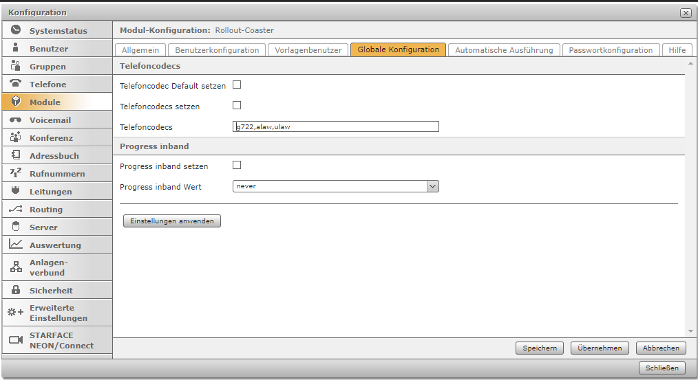 Über den Haken „Telefoncodec Default setzen“ werden die definierten Codecs als Default Wert gespeichert und werden so auch auf alle neuen Endgeräte übertragen. Aktiviere den Haken „Telefoncodecs setzen“, um die definierten Telefoncodecs auf alle vorhandenen Telefone auszurollen. Es kann über ein Freitextfeld selbst definiert werden, welche Telefoncodecs benutzt werden sollen. Definiere hier entsprechende Codecs durch „ , “ getrennt. (Bsp.: „g722,alaw,ulaw“).