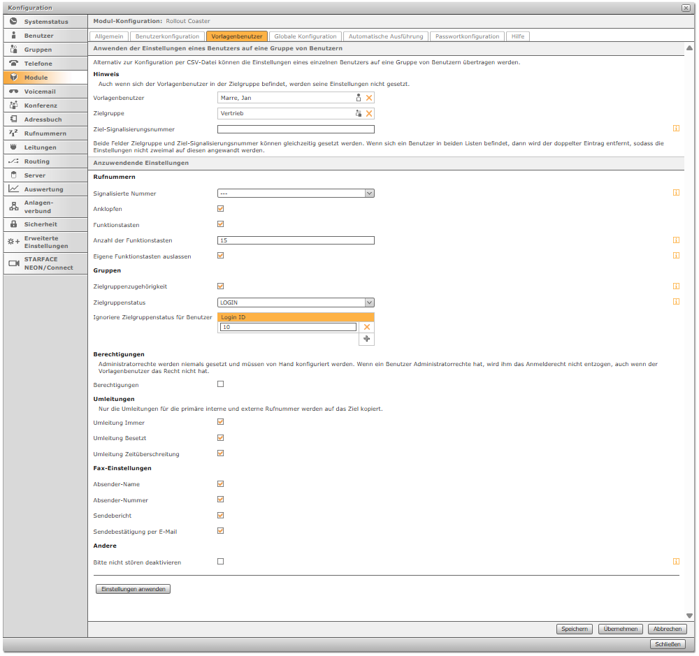 Mit dem Modul “Rollout Coaster” für STARFACE kann nicht nur der kompletten STARFACE User-Rechte-Rollout durchgeführt werden, sondern auch einzelne User-Einstellungen, wie zum Beispiel Anklopfen oder Umleitungen können ganz einfach flächendeckend ausgerollt werden.