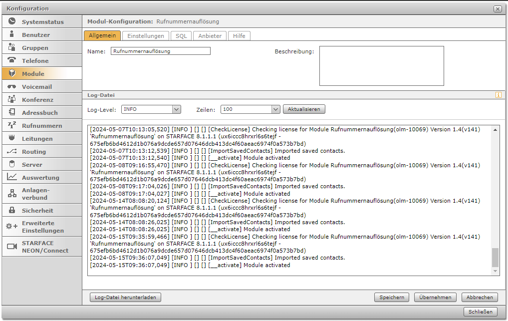 Jedes Modul informiert in den Leveln "ERROR, WARN, INFO, DEBUG, TRACE" in den jeweils verschiedenen Abstufungen über Prozesse, die im Modulbetrieb ablaufen. Falls ein Fehler auftritt hat man hier die Möglichkeit, die Logdatei zu speichern. Standardeinstellung ist das Level "INFO".