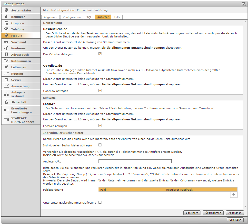 Dieses Modul erweitert die Telefonanlage um die Funktion, online Adressbücher nach Rufnummern zu durchsuchen. So werden auch bisher unbekannte Anrufer mit Namen angezeigt, sofern diese in den Abgefragten Verzeichnissen auffindbar sind.