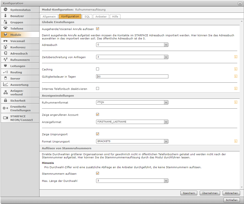 | Die Auflösung von ausgehenden Anrufen findet nur statt, wenn die angerufene Nummer bereits als Kontakt im STARFACE Adressbuch hinterlegt ist. Es erfolgt bei ausgehenden Anrufen keine Abfrage über die Anbieter. |