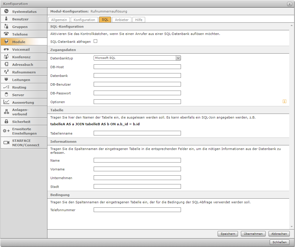 Aktiviere die Checkbox "SQL-Datenbank abfragen", um Anrufer aus einer SQL-Datenbank auflösen zu lassen.