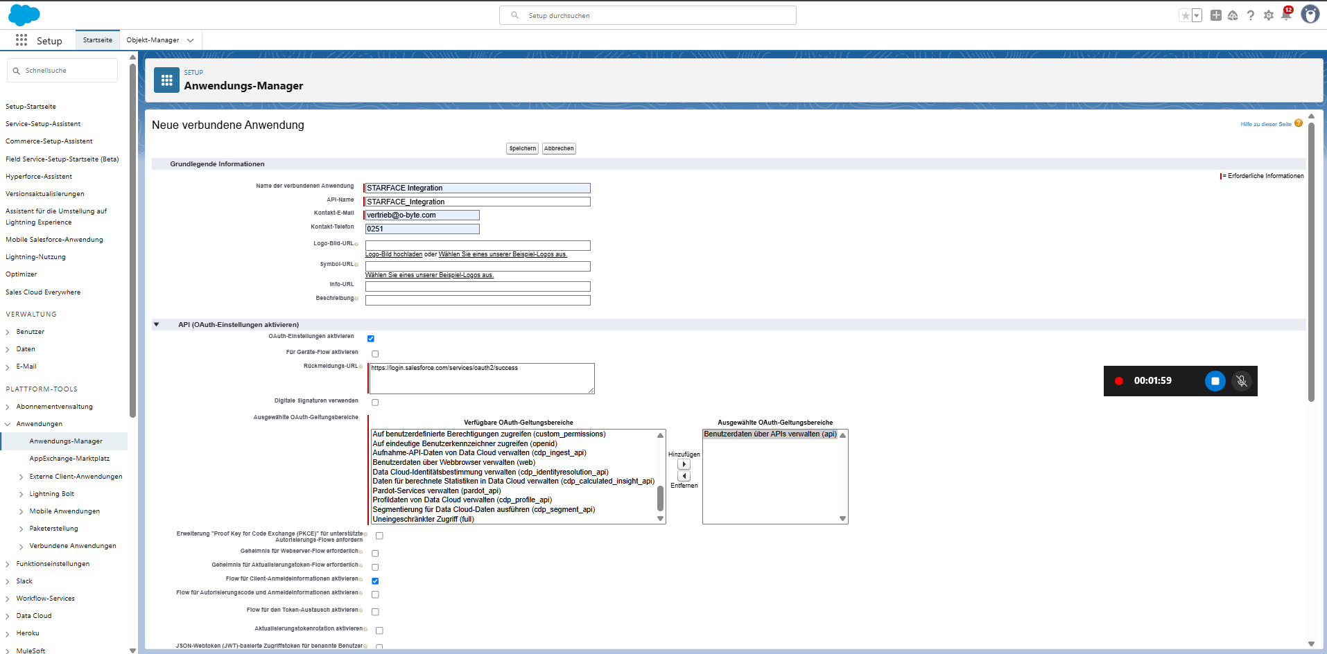 Für den Betrieb des Moduls muss in Salesforce eine Applikation erstellt werden. Es ist wichtig, die einzelnen Schritte genau zu befolgen. Werden einzelne Schritte übersprungen, kann dies im Nachgang nur sehr schwer nachverfolgt werden. Es wird empfohlen, die gesamte Dokumentation zu lesen, bevor mit der Einrichtung begonnen wird.