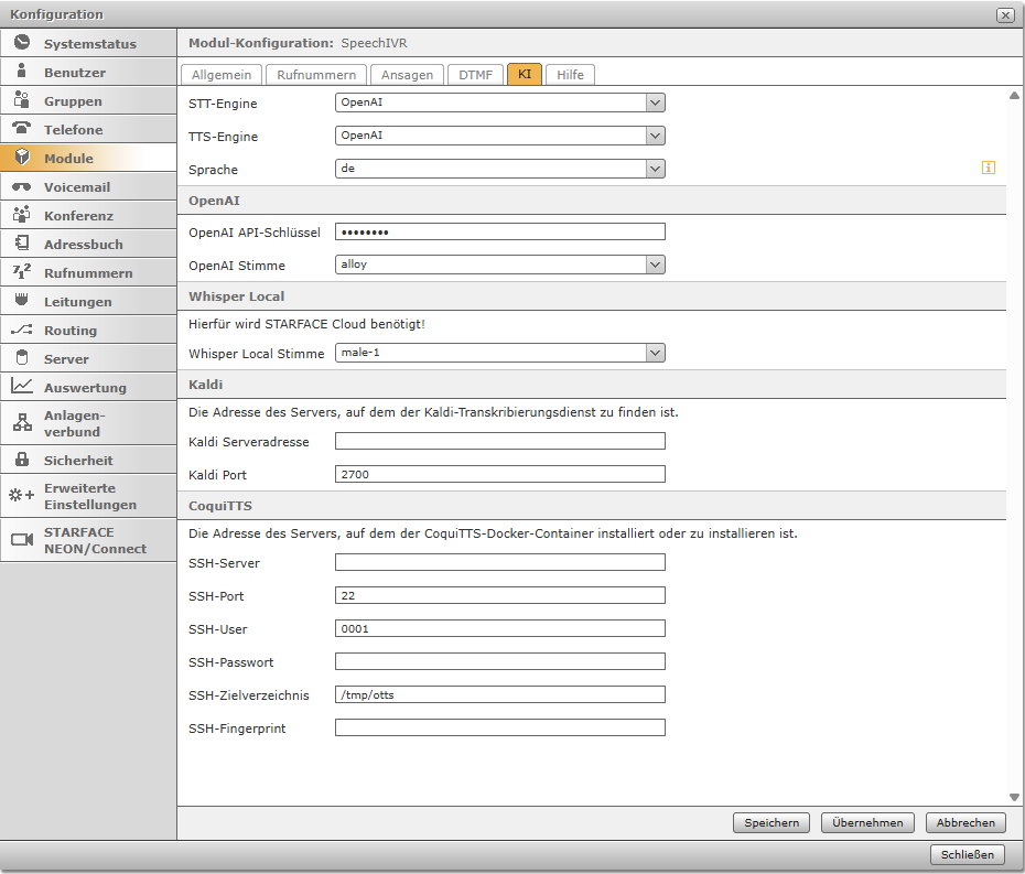 Wähle bei TTS-Engine aus, welches KI-Modell für die Text-To-Speech Funktion verwendet werden soll.