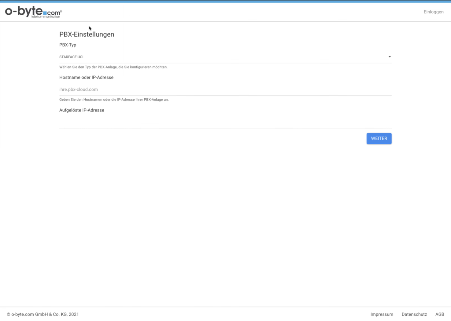 Gebe bei Hostname oder IP-Adresse den Hostnamen oder die IP-Adresse der entsprechenden Telefonanlage ein. Der UCI Proxy wird mit einem Klick auf "Weiter" eine zugehörige IP-Adresse aufzulösen, falls vorher ein DNS-Name eingegeben wurde.