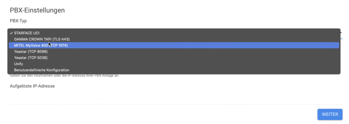 Wähle bei PBX-Typ aus, mit welcher Telefonanlage kommuniziert werden soll. Alternativ kann auch eine benutzerdefinierte Konfiguration vorgenommen werden.