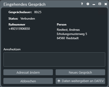 In dem Fenster “Gesprächsnotizen” wird Ihnen zudem der Name des Mandanten (sofern die Telefonnummer des Anrufers einem Mandanten zugeordnet ist) angezeigt. Zur leichteren Identifizierung eines Mandanten werden Ihnen zusätzlich die zugehörige Rufnummer und die E-Mail Adresse. Über das Eingabefeld können Sie während des Gesprächs oder im Anschluss Ihre Notizen zum Telefonat erfassen.