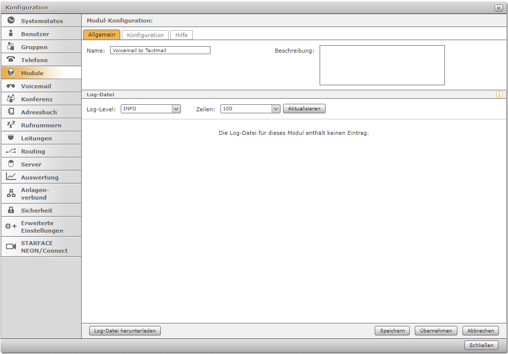Jedes Modul informiert in den Levels "ERROR, WARN, INFO, DEBUG, TRACE" in den jeweils verschiedenen Abstufungen über Prozesse, die im Modulbetrieb ablaufen. Falls ein Fehler auftritt hat man hier die Möglichkeit, die Logdatei zu speichern. Standardeinstellung ist das Level "INFO".