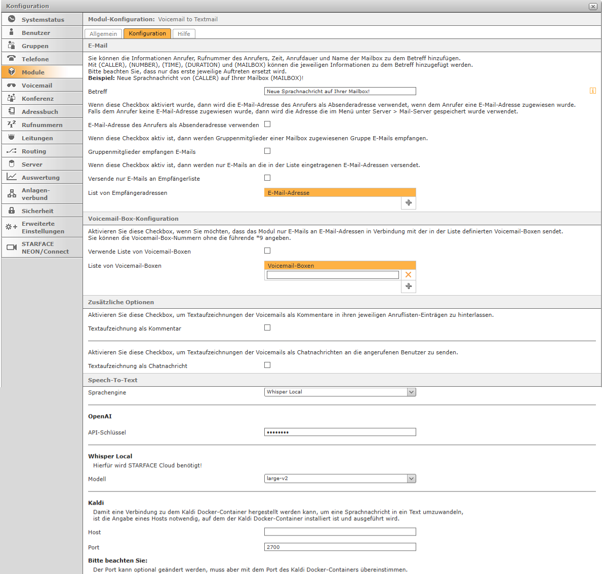 Transkribieren mit Whisper: Es wird eine STARFACE Cloud benötigt. → weiter bei STARFACE-Konfiguration.