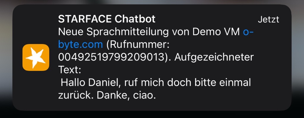 "Voicemail to Textmail" für STARFACE wandelt eingehende Sprachnachrichten in Text um und stellt diese als E-Mail oder Chatnachricht in der STARFACE-App zur Verfügung. Dies spart Zeit und steigert die Effizienz, da das manuelle Abhören und Transkribieren von Voicemails entfällt.