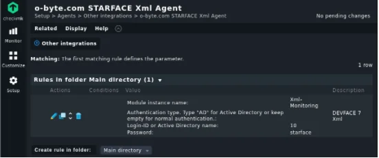 In der Konfiguration müssen nur ein Name für die Rule (frei wählbar), der Name der Modulinstanz (Name vom STARFACE Modul), der Port der STARFACE (Feld leer lassen für den Standardport), die Login-ID und das Passwort eines STARFACE Admins angegeben werden. Für AD-Integration “AD” als Authentication type angeben. Danach mit Save speichern.