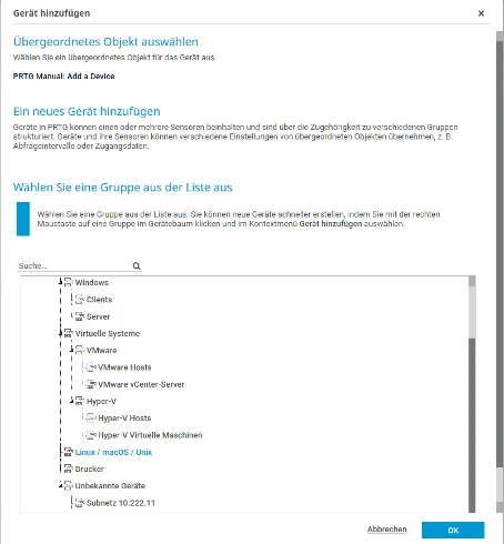 Auf der Weboberfläche von PRTG Network Monitor klicke auf „Geräte“→“Gerät hinzufügen“. Im neuen geöffneten Fenster wähle, Linux / macOS / Unix“ aus und bestätige mit „OK“.