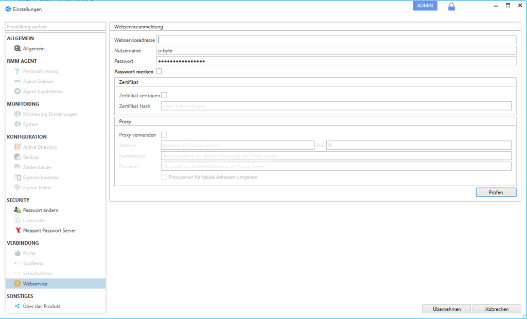 Klicke unter "Verbindung" auf "Webservice". Gebe hier die Webserviceadresse, Nutzername und das Passwort an. Drücke anschließend auf den Button "Prüfen". Wenn neben dem Button ein "X" erscheint, sind die Eingaben nicht korrekt und müssen überprüft werden. Erscheint ein grüner Haken sind die Einstellungen korrekt. Fahre in diesem Fall mit einem Klick auf den "Übernehmen"-Button fort.
