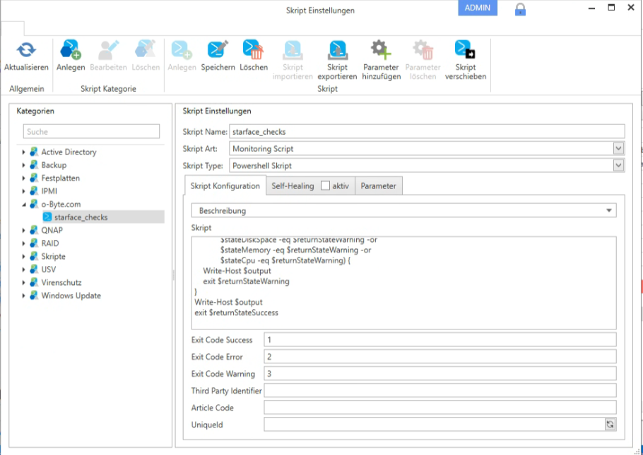Wähle links in der Sidebar „Kategorien“ „o-Byte.com“ aus und klicke unter der Gruppe „Skript“ auf „Skript importieren“. Wähle anschließend die Datei „starface_checks.ps1“ aus der entpackten Datei „XmlMonitoring-1.13.0.zip“ aus. Bestätige die Warnmeldung mit „Ja“. Es öffnet sich ein Arbeitsfenster.