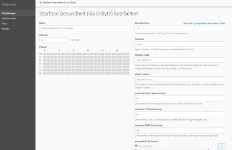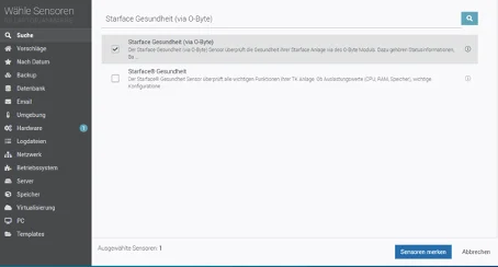 Klicke oben rechts auf den Button „Sensor hinzufügen“. Suche nach „Starface Gesundheit (via O-Byte)“. Wähle den Sensor aus und bestätige mit einem Klick auf den Button “Sensoren merken”. Klicke auf der nächsten Seite auf den Button „Sensoren anlegen“.