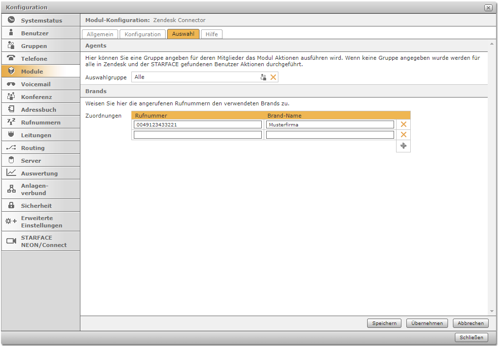 Wähle hier, falls gewünscht eine Gruppe, auf die das Modul angewendet werden soll. Wenn eine Gruppe ausgewählt wurde reagiert das Modul nur auf Mitglieder dieser Gruppe, ansonsten auf alle STARFACE-Benutzer die zu Zendesk-Benutzern zugeordnet werden konnten.